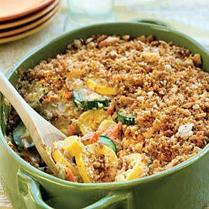 In a saucepan, cook sliced squash and chopped onion in boiling salted water for minutes. Drain. Combine cream of mushroom and sour cream. Stir in shredded carrot. Fold in drained squash and onions. Combine stuffing mix and butter or margarine. Spread half of stuffing mixture in bottom of 12” x 7 ½ “ x 2 “ baking dish. Spoon vegetable mixture atop. Sprinkle remaining stuffing over vegetable. Cook at 350 for 25-30 minutes. Serves 6.
