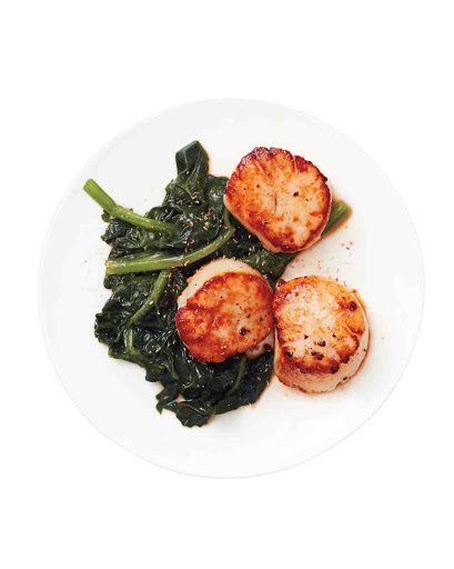 Heat a skillet over medium-high heat; swirl in just enough coconut oil to coat bottom. Pat scallops dry, season with coarse salt, and add to skillet. Cook, undisturbed, until browned on bottom, 1 to 2 minutes. Flip, season with coarse salt, and cook until browned and cooked through but still pink in center, 1 to 2 minutes. Serve with wilted spinach and a pinch of freshly grated nutmeg.