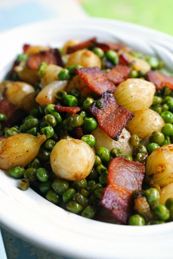 In a large pot of water, boil the pearl onions for 3 minutes. Add the peas and boil for an additional 2 minutes. Drain.