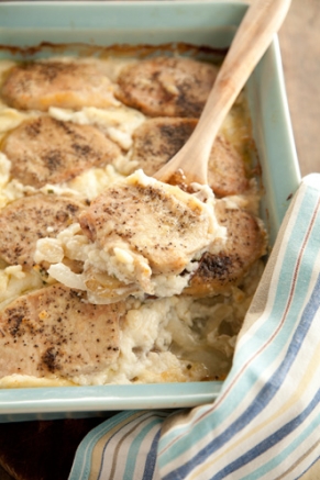Bake at 350 degrees F for 50 to 60 minutes. The juices from the pork chops will drip down into the potatoes. Delicious!