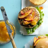4. Serve on lettuce-lined buns with additional peach slices and remaining Peach Ketchup.