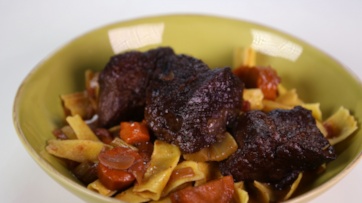 Scoop a few ladlefuls of the braise into a large sauté pan, and add the bowties. Add spoonfuls of the sour cream, to taste, and toss everything to combine. Serve, garnished with parsley.