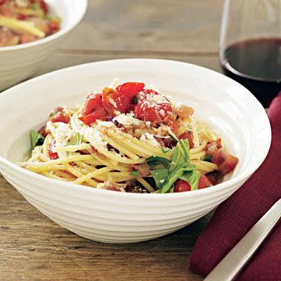 While the pasta is working, in a large skillet, heat the EVOO, 3 turns of the pan, over medium to medium-high heat. Add the pancetta and cook until crisp, 3 to 4 minutes. Add the red onion, garlic and crushed red pepper and cook until softened, 3 to 4 minutes. Stir in the wine and cook for 1 minute, then add the tomatoes, parsley and a generous amount of salt and pepper. Cook until the tomatoes burst, 8 to 10 minutes.