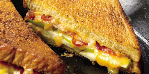 Heat the butter in a large skillet or nonstick saute pan over low heat. Slather 4 slices of bread with the mustard, then divide the cheese, apples, and bacon among them. Top with the other bread slices and add to the hot pan. The key to a great grilled cheese (i.e., crispy crust, fully melted cheese) is patience, so cook these sandwiches slowly until each side is deep brown and crunchy, about 10 to 12 minutes total.
