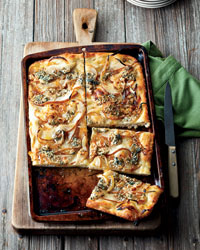 Focaccia with Caramelized Onions, Pear and Blue Cheese