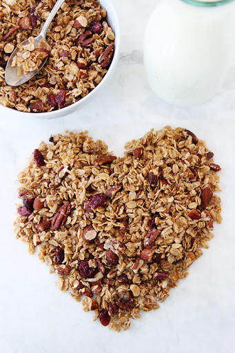 2. In a large bowl, combine oats, coconut, almonds, pecans, brown sugar, cinnamon, and sea salt. Set aside.