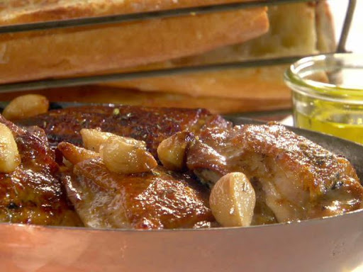 Rinse and pat dry the chicken. Salt and pepper liberally and allow to temper on a cutting board while you prepare the garlic. In a large ovenproof saute pan over medium heat, cook the whole garlic cloves in olive oil and butter, stirring occasionally, until lightly golden, about 10 minutes. Remove the garlic from the pan and set aside. Increase the heat to medium high and brown the chicken skin-side down until the skin is golden and crispy, about 5 minutes. Turn the chicken over, sprinkle on herbes de Provence. Add the garlic back to the pan and place hot pan in oven. Bake the chicken until cooked through, about 25 minutes. Once the chicken is done, remove chicken thighs and garlic to a platter. Place the pan over medium-high heat and sprinkle the drippings with flour and stir to incorporate. Deglaze the pan with the stock and lemon juice. Pour the sauce over the chicken on the platter and serve with bread for sauce-mopping and garlic-spreading.