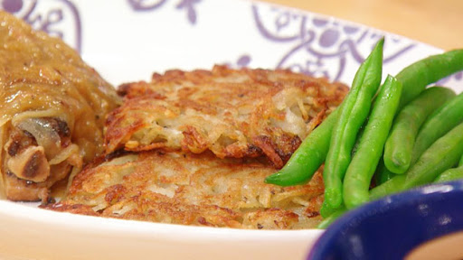 Set up a bowl of cold salted water. Peel the potatoes and as you peel them, put them in the bowl of salted water. Drain the potatoes, grate them and place them in a sieve set over another bowl. Let them drain them over the bowl collecting all of that liquid for a good 20 to 30 minutes. Press on the potatoes to get out more liquid.