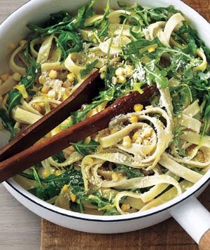 Creamy Fettuccine with Leeks, Corn, and Arugula