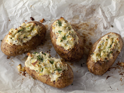 Add the leek mixture, cream cheese and milk to the potato and mash well with a fork until combined but slightly chunky. Stir in the chopped parsley. Spoon the filling back into the potato shells, about 1/2 cup of filling for each potato and place back on the baking sheet. Bake until heated through and the tops are lightly browned, 20 to 25 minutes. Garnish with extra parsley.