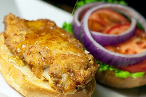 1.Place chicken breasts in a resealable plastic bag.Pound with the flat side of meat mallet until flattened to 1/4 inch thick (a rolling pin would work too). 2.In a bowl whisk together buttermilk, egg, 1 1/4 teaspoon seasoning salt and Tabasco. Place chicken breasts in the bowl, turn to coat, cover and refrigerate for at least 2 hours. 3.After marinating the chicken, place flour, baking powder and 1 tablespoon of seasoning salt in a resealable plastic bag. Remove chicken from marinade and transfer to flour. Shake to coat. Allow to sit for 15 minutes. 4.Heat 1/ 2 inch of oil in a skillet over medium heat. Once the oil starts to shimmer, sprinkle a little flour over it. If it sizzles its ready. Fry chicken until golden brown and cooked through, about 3-4 minutes per side. Transfer to a paper towel lined plate and set aside. 5.Toast kaiser rolls. Spread mayonnaise on roll. Place chicken breast on bottom half of roll, drizzle 1 teaspoon of honey over each chicken breast. Add tomato, lettuce, onion and top half of roll. 6.Serve. As I learned, if you happen to be eating this with anyone else at the table, hang on to your sandwich or it just might disappear. Enjoy!