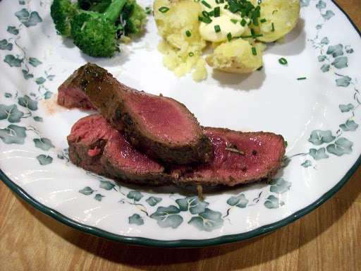 Cook the steak for about 6 to 7 minutes on each side, or until the outside is seared and the inside is still rare. An instant-read thermometer should read 140 degrees. If more doneness is desired, cook longer.