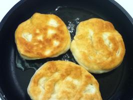 Punch down the dough and squeeze off pieces of dough approx 1/3 cup, flatten to approx 1/2" circular or triangle shape.