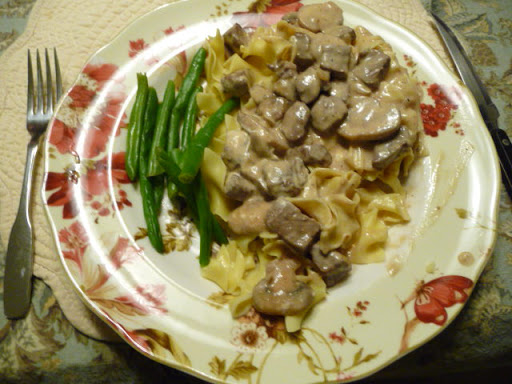 Add beef mixture, sherry, salt and pepper to pan, bring to a boil. Reduce heat, and simmer 4 minutes. Remove from heat, let stand 30 seconds. Stir in sour cream.