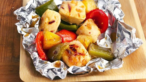 2. Cut 4 (24x12-inch) sheets of heavy-duty foil. Divide chicken, bell peppers, pineapple chunks and pineapple preserves mixture among foil sheets. Sprinkle with salt. Bring up 2 sides of foil so edges meet. Seal edges, making tight 1/2-inch fold; fold again, allowing space for heat circulation and expansion. Fold other sides to seal.