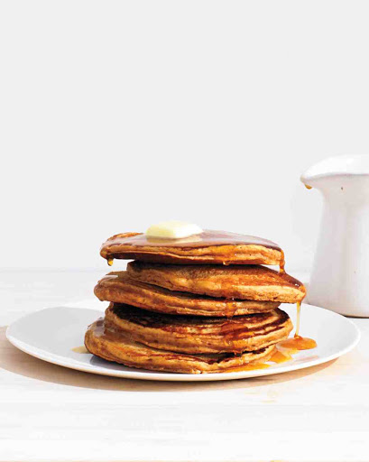 For the batter, whisk together flour, baking powder, baking soda, salt, ginger, cinnamon, cloves, and nutmeg. Add eggs, molasses, and buttermilk and stir until just combined. Cook pancakes on a hot griddle.