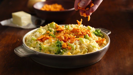2. Meanwhile, in 10-inch nonstick skillet, heat 1 tablespoon vegetable oil over medium-high heat. Add onion; cook, stirring occasionally, until crisp-tender. Reduce heat to medium. Stir in 1/2 teaspoon salt, the cooking sauce and milk; heat to boiling. Stir in cooked rice and thawed broccoli until well mixed. Spoon into casserole.