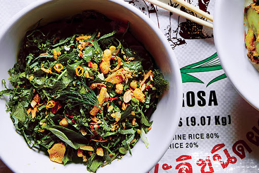 Add kale, celery, scallions, cilantro, mint, and basil to dressing and toss to coat (salad should be very heavily dressed).