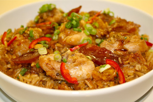 Wash the rice in several changes of water and place into a claypot with 420 ml of water. Cook, covered, over medium heat, until the water is almost absorbed. Add the chicken with its marinade, the Chinese sausage and salted fish (if using), over the rice, and drizzle in about 2 Tbsp of the sauce. Lower the heat and cook, covered, until the rice and chicken are cooked, about 10-15 minutes. Flake the rice, cover the lid and cook for further 5 minutes. Remove from the heat and top with chopped scallions. Serve immediately.