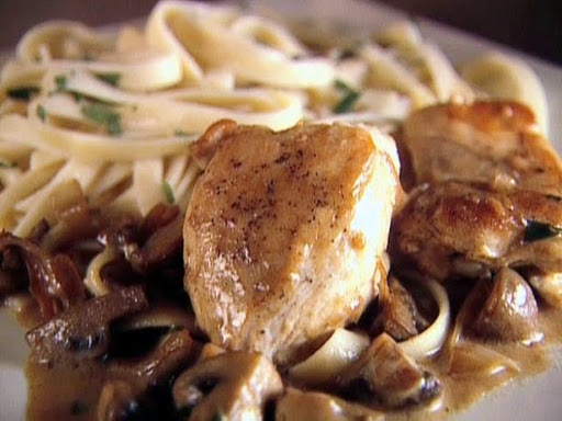 Meanwhile, bring a large pot of salted water to a boil. Add the fettuccine and cook until al dente, stirring occasionally, about 8 minutes. Drain. Toss the fettuccine with 3 tablespoons of butter and season, to taste, with salt and pepper. Swirl the fettuccine onto serving plates. Spoon the chicken mixture over top. Garnish with parsley sprigs and serve.