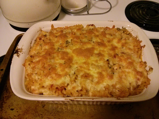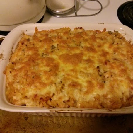 Pour into 6 cup (1.5 L) casserole dish. Sprinkle with shredded cheese. Cover and bake in preheated 350 F (180 C) oven for about 20 minutes or until bubbling.