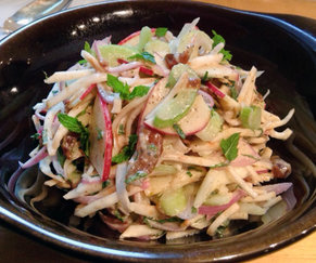 Peel and core onion, then slice very thin. Rinse under hot water, then in cold, and drain. Add to celery root in bowl.