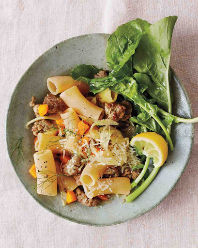 Meanwhile, heat a large straight-sided skillet over medium-high heat. Add 1 tablespoon oil and sausage; cook, breaking into pieces, until browned, about 5 minutes. Transfer to a plate. Drain all but 1 tablespoon fat; reduce heat to medium. Add remaining 1 tablespoon oil, fennel, and carrots. Season with salt and pepper. Cook, stirring occasionally, until tender, about 10 minutes. Add broth; bring to a simmer. Add pasta, pasta water, lemon zest and juice, cheese, and sausage. Simmer, stirring, 3 to 4 minutes. Remove from heat; let stand to thicken, about 10 minutes. Drizzle with oil. Serve with fennel fronds, lemon wedges, cheese, and arugula.