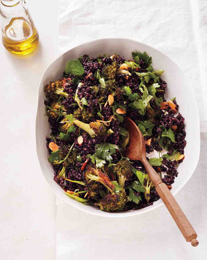 Meanwhile, preheat oven to 425 degrees. On a rimmed baking sheet, toss broccoli and garlic with 2 tablespoons oil. Season with 1/4 teaspoon salt and pepper. Roast, stirring once, until tender, about 20 minutes. Remove and reserve garlic; transfer broccoli to bowl with rice.
