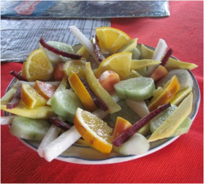 Para la ensalada, Se cortan en pedazos pequeños la jícama, manzana, el mango, la pera y el pepino.