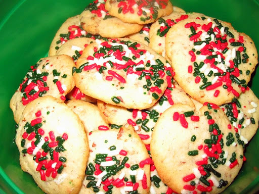 Chill dough at least one hour. Shape into 1" balls, flatten, and dip in sprinkles. Bake at 350 degrees for 15 minutes (convection oven).
