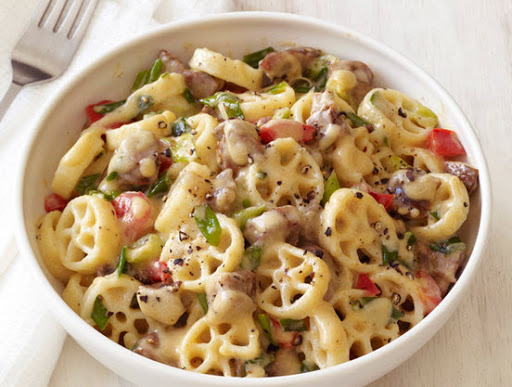 Meanwhile, combine the olive oil and sausage in a large skillet over high heat and cook, stirring, until the sausage starts to brown, about 2 minutes. Stir in the scallions and bell pepper and cook until the vegetables are slightly soft, about 3 more minutes. Add the Cajun spice and flour and cook, stirring, 2 more minutes. Gradually whisk in the milk and continue whisking until the sauce is thick and smooth, about 5 more minutes.