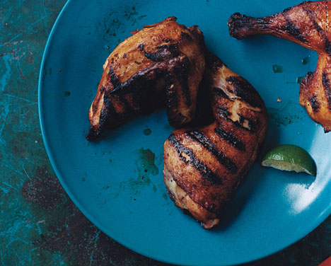 If you aren't able to grill outdoors, chicken (quartered) can be roasted in middle of a 500°F oven in a 13- by 9-inch roasting pan with 1 cup water 30 minutes, then tented with foil and roasted until browned and cooked through, about 15 minutes more.