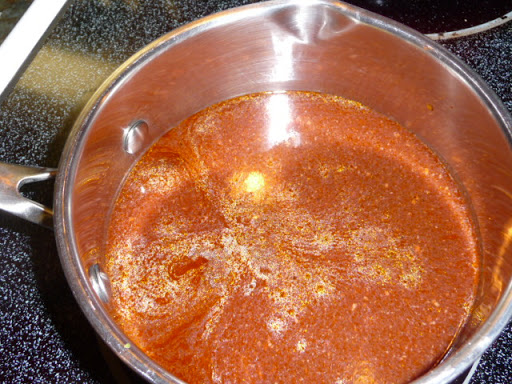 Deglaze with red wine, scraping up all the brown bits on the bottom of the pan.