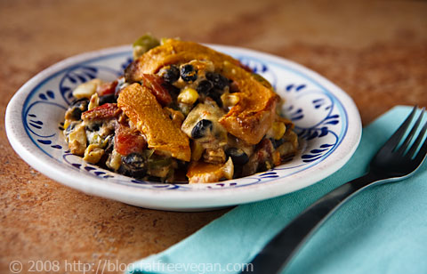 In a blender, combine the reserved *tomato liquid (about 1/2 cup) with the soymilk and remaining ingredients. Blend well and pour over the pumpkin. Cover tightly, and bake for 30 minutes. Remove the cover and bake for 20-30 minutes, until sauce is thick and bubbly and pumpkin is tender.