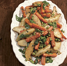 Hearty caramelized carrots and potatoes are the base for this delicious side dish, while peas, baby spinach, lemon, and tarragon add a bright, fresh twist. Serve with roast chicken or seared fish.