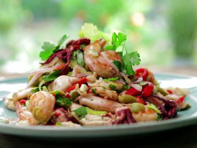 Combine the shrimp,crab, peppers, celery, onions, olives, cornichon and parsley in a large bowl. In a second bowl, whisk together the vinegar, olive oil, lemon zest and juice, and season with salt and pepper. Pour over the salad and toss to combine. Cover and refrigerate for 30 minutes to allow the flavors to meld.