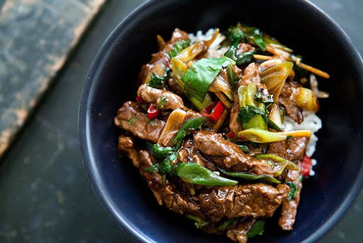 2 In a medium bowl, whisk together the marinade ingredients; the soy sauce, vinegar, grated ginger, honey, red chile flakes, and cumin. Mix the beef in with the marinade to coat and let it sit for at least 30 minutes, and up to 4 hours, in the fridge.