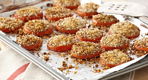 1. Preheat oven to 425°F. Mix panko, Parmesan cheese and 2 teaspoons of the Seasoning in shallow bowl. Mix vinegar, honey and remaining 1/2 teaspoon Seasoning in another bowl. Dip each slice of tomato into vinegar mixture then coat in panko mixture. Place on foil-lined baking sheet.