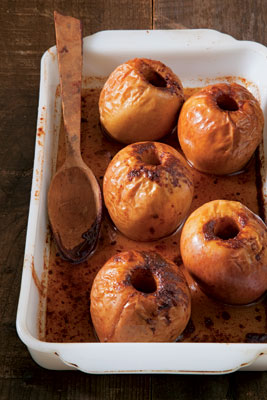 1. Make the baked apples: Heat oven to 325°. Combine sugar, syrup, butter, cinnamon, and salt in a bowl; set aside. Cut ¼" from bottom of apples so that they sit flat; transfer apples to a 9" x 13" baking pan. Fill hollow cores with reserved sugar–syrup mixture. Cover apples with foil; bake until tender, about 50 minutes.