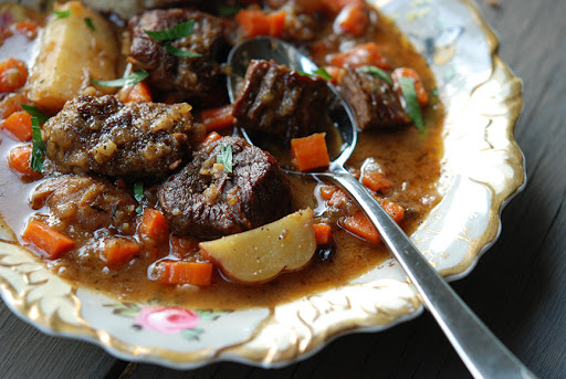 Gently stir the potatoes and carrots into the stew, cover and bake for about 25 minutes longer, until the vegetables are tender. Discard the herb bundle. Stir in the Dijon and vinegar, season the stew with salt and white pepper and serve.