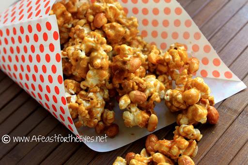 Preheat your oven to 200°F and line a large rimmed baking sheet (18" x 13") with parchment paper (or use a deep roasting pan, which is my preference. Pour the popped corn into a large bowl (at least 6 quarts); remove any unpopped kernels. If using, add the peanuts, mix and set aside.