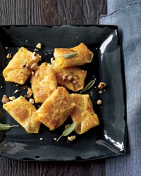 In a large nonstick skillet, heat 1 tablespoon of the olive oil. Add the shallot and minced sage and cook over moderate heat until the shallot is softened, 3 minutes. Mix the shallot and sage into the mashed squash and season with salt and pepper. Wipe out the skillet.