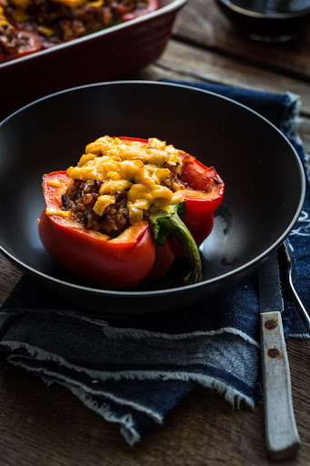 In a large bowl, mix together rice and meat sauce. Divide mixture between the pepper halves. Add 2-3 tablespoons of water in the bottom of the baking dish. Bake peppers for 20 minutes. Sprinkle cheese over the tops of the stuffed peppers and bake for an additional 10-15 minutes or until cheese is melted and filling is hot.