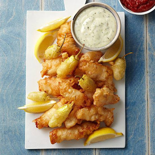 3. With a slotted spoon, remove chicken and peppers from oil and place on a paper-towel lined baking sheet. Serve immediately with, if desired, cocktail sauce, ranch dressing and lemon wedges.