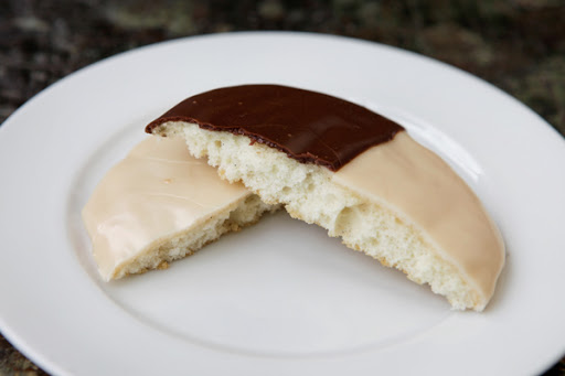 Take a small spoonful of chocolate frosting and drizzle it down the middle of the cookie, then spread it away from the center and down to the edges. If you’d like a very sharp line between black and white, lay a piece of butcher’s twine down the middle of the cookie to give yourself a guideline.