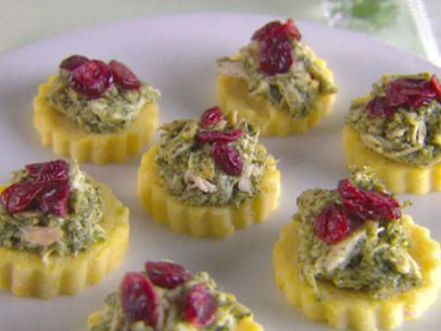 To assemble: Using a 2-inch diameter scalloped cookie cutter, cut the polenta into tartlet shapes, about 24, and place them on a serving platter. Top each polenta tartlet with a spoonful of chicken. Top the chicken with a few dried cranberries. Serve.
