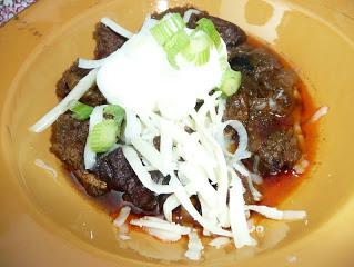 Serve this over hot cooked rice, garnished with chopped onions, shredded cheese, and sour cream.