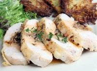 The bread stuffing in this breast was heavy and thick and failed to adhere to the chicken.