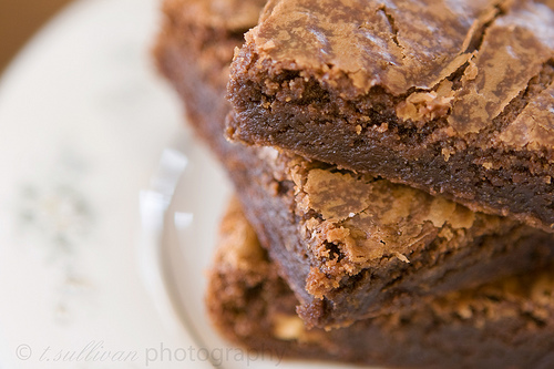 Stir the sugar into the melted butter. Beat in the eggs one at a time, then stir in the vanilla. Add the dry ingredients and mix until combined.