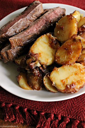 - 3 lbs red potatoes – cooked with skins and sliced (be sure to let them cool before you slice or they’ll crumble)